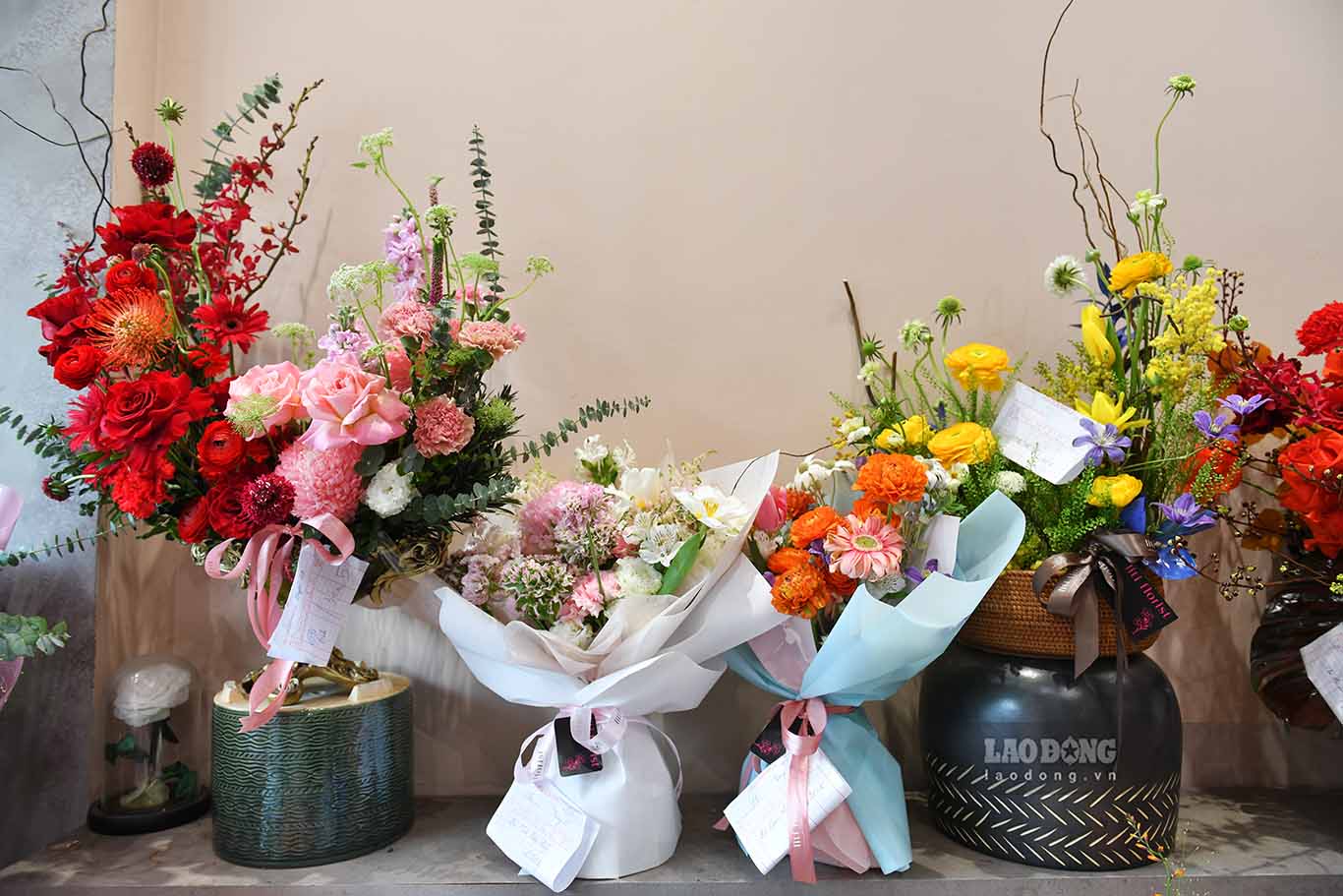 Theo đại diện cửa hàng, chi phí nhập hoa năm nay đang tăng cao, giá nhân công, phụ kiện gói hoa tăng đã ảnh hưởng trực tiếp đến giá bán.