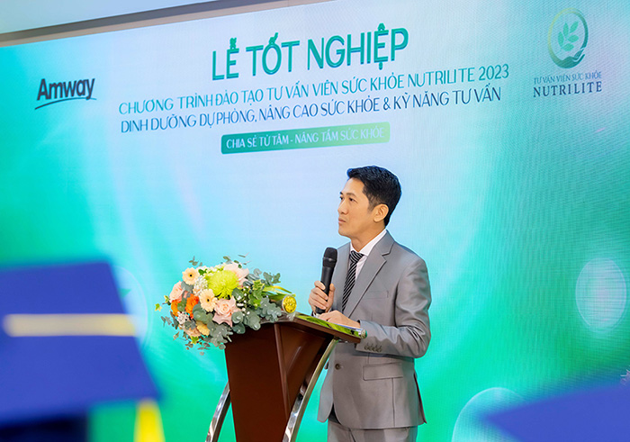 Ông Huỳnh Thiên Triều – Tổng Giám đốc Amway Việt Nam phát biểu tại buổi lễ. Ảnh: AmwayÔng Huỳnh Thiên Triều – Tổng Giám đốc Công ty Amway Việt Nam - cho biết: “Sự thành công của chương trình đào tạo Tư vấn viên sức khỏe dinh dưỡng Nutrilite 2022 - 2023 đã đưa Amway tiến gần hơn đến mục tiêu xây dựng và mở rộng nhiều hơn những cộng đồng chăm sóc sức khỏe chủ động trên các nền tảng trực tuyến và trực tiếp, từ đó nâng cao nhận thức và thói quen thực hành dinh dưỡng một cách khoa học đến với nhiều người Việt Nam hơn”.
