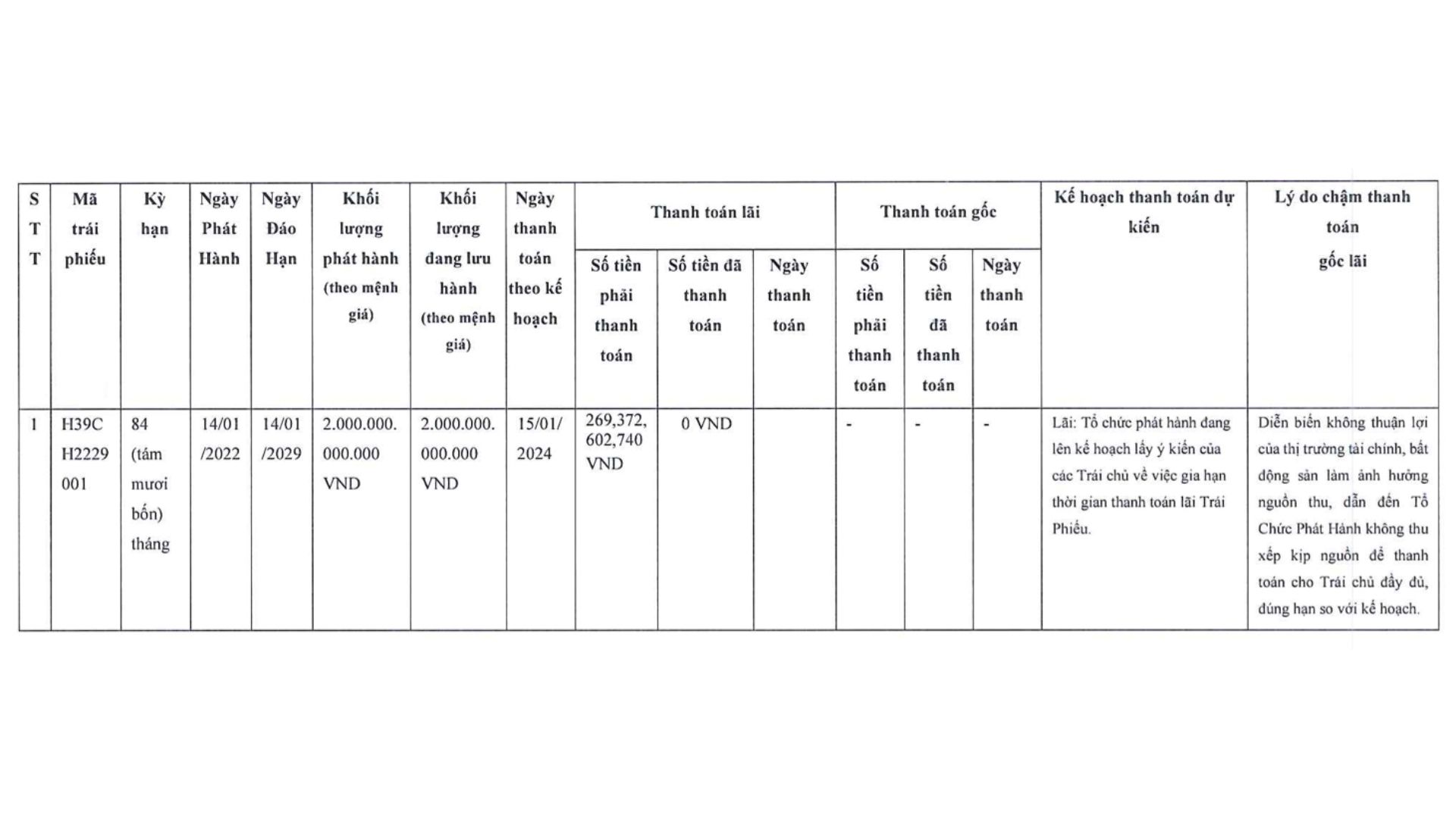 Theo đó, lô trái phiếu H39CH2229001 có kỳ hạn 84 tháng, đáo hạn ngày 14.1.2029 với tổng giá trị 2.000 tỉ đồng. Lãi suất được công bố là 9%/năm. Ngày 15.1.2024, doanh nghiệp phải thanh toán tiền lãi gần 270 tỉ đồng nhưng chưa thực hiện.