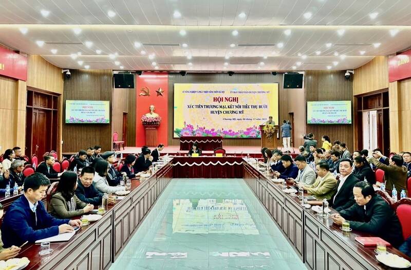 Hội nghị xúc tiến thương mại, kết nối với mục tiêu thúc đẩy tiêu thụ khoảng 14.000 tấn bưởi. Ảnh: Sở Nông nghiệp và Phát triển Nông thôn Hà NộiÔng Tạ Văn Tường - Phó Giám đốc Sở Nông nghiệp và Phát triển Nông thôn Hà Nội - cho biết, thực hiện chủ trương người Việt Nam ưu tiên dùng hàng Việt Nam, thời gian qua, Sở đã chủ trì, phối hợp triển khai nhiều hoạt động xúc tiến thương mại.