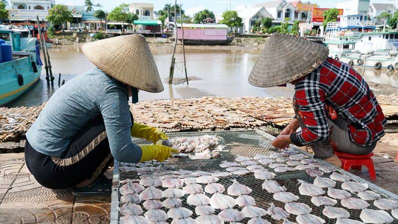 Tại Trần Đề có rất nhiều lao động tham gia vào sản xuất, chế biến khô. Ảnh: Phương AnhÔng Tiến Chương - Phó Chủ tịch UBND thị trấn Trần Đề - thông tin: Toàn thị trấn có 410 tàu, thuyền khai thác thủy sản, trong đó có 336 tàu đánh bắt xa bờ với sản lượng hàng năm đạt trên 40.000 tấn. Toàn thị trấn có 12 cơ sở sản xuất chế biến khô và hàng chục vựa mua bán khô trên toàn địa bàn.