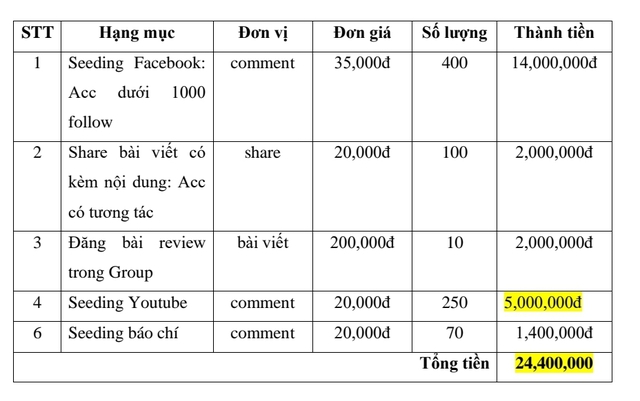 Giá dịch vụ một số hoạt động seeding cơ bản