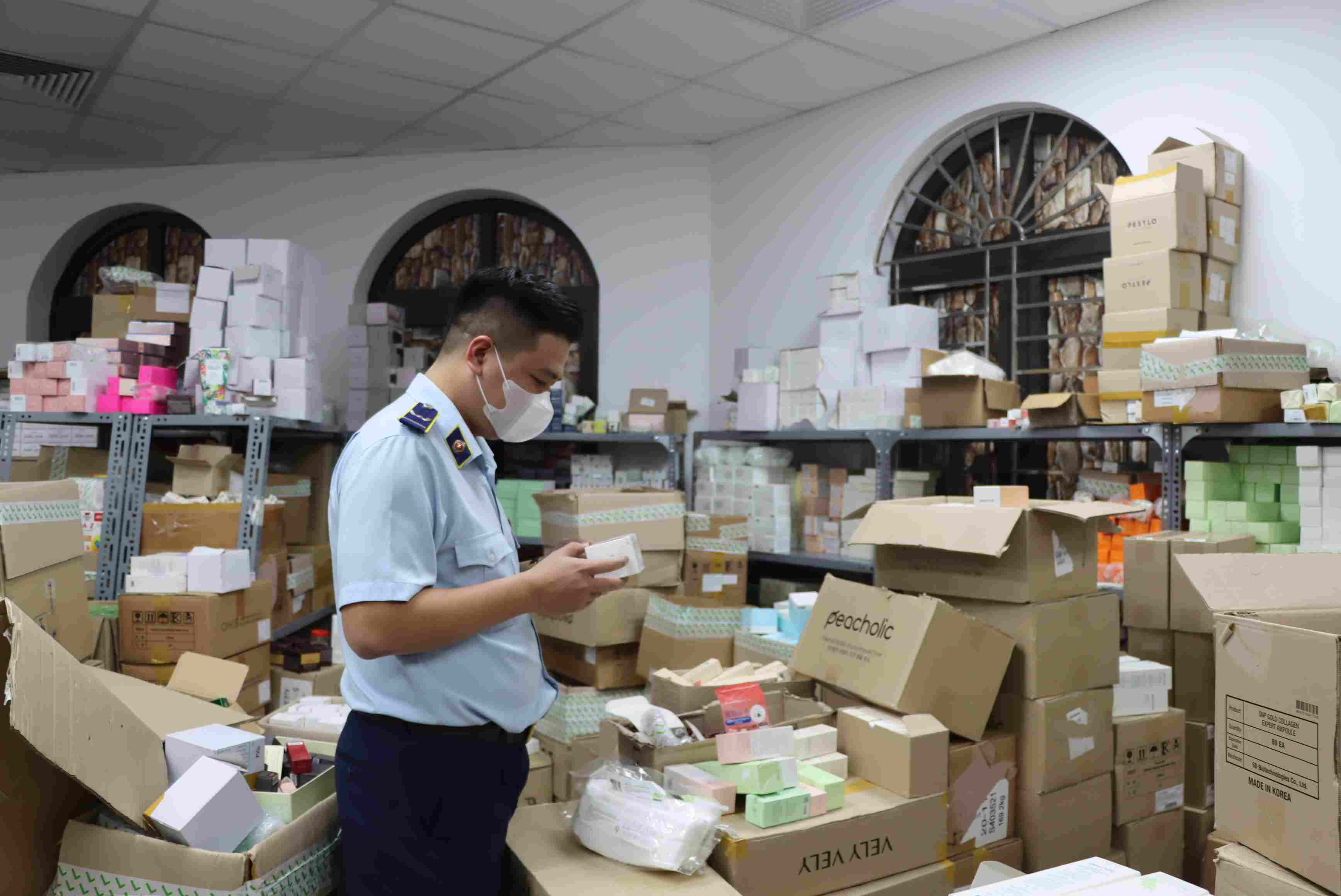 Hiện lực lượng chức năng đang tiến hành kiểm đếm, phân loại sản phẩm và liên hệ với chủ cơ sở để kiểm tra tính hợp pháp của hàng hóa tại kho hàng.