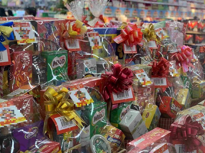 Theo ghi nhận của PV Lao Động, tại một siêu thị ở quận Cầu Giấy, Hà Nội đã trưng bày nhiều loại quà tặng Tết ở lối vào siêu thị nhằm thu hút khách hàng.