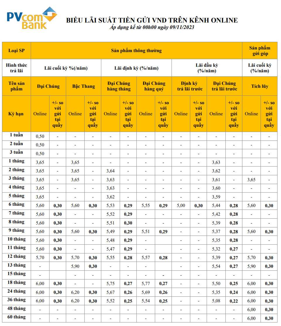 Biểu lãi suất của PVcomBank. Ảnh chụp màn hình