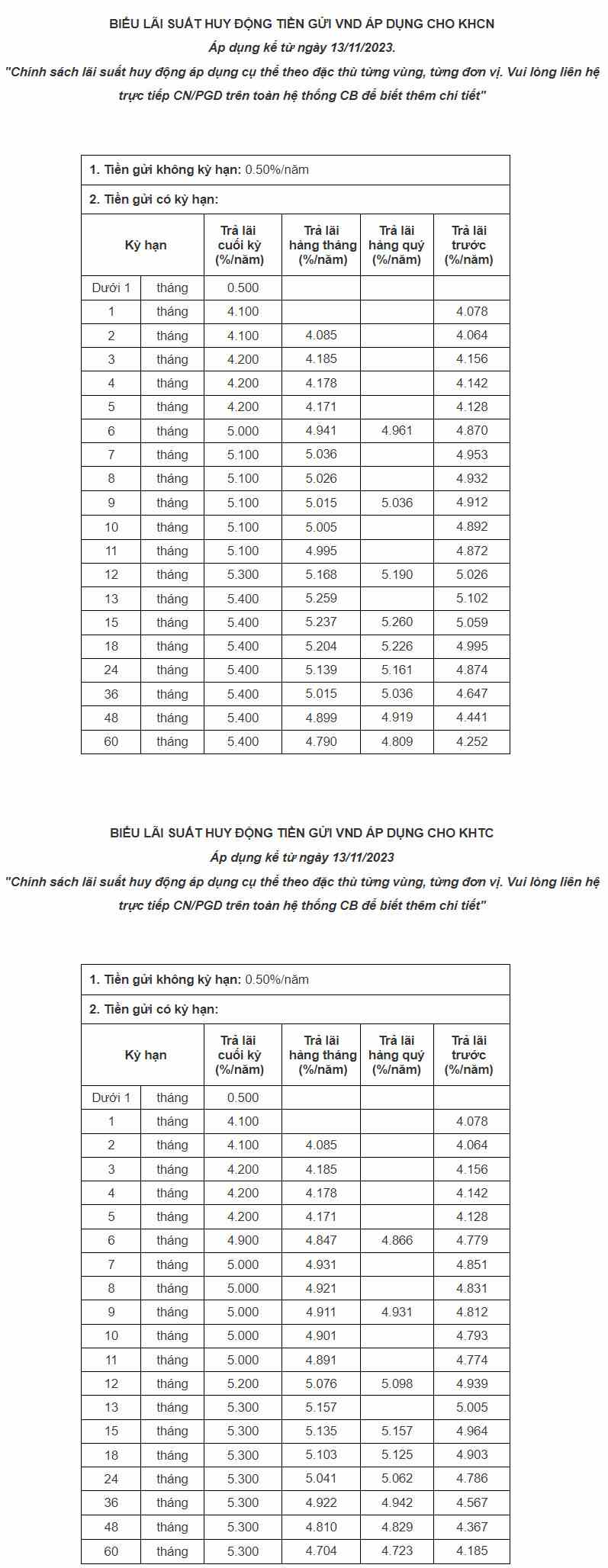 Biểu lãi suất của CB. Ảnh chụp màn hìnhNgoài ra dưới đây là biểu lãi suất một số ngân hàng khác, ghi nhận ngày 6.12.2023, bạn đọc có thế tham khảo: