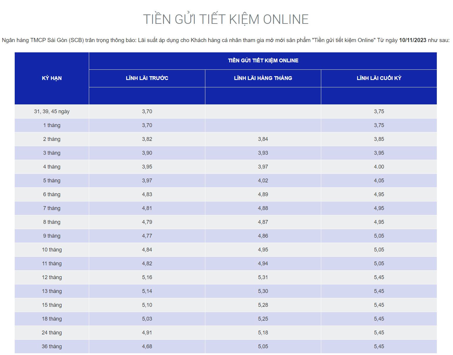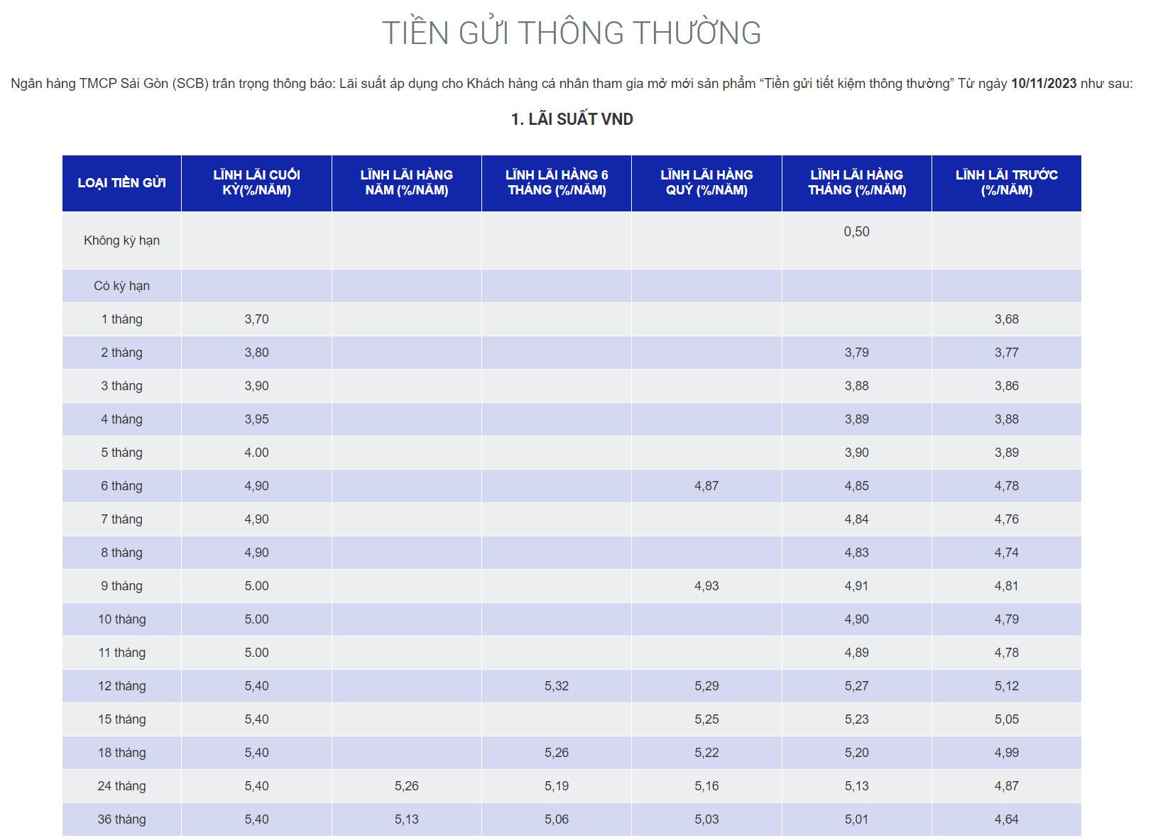 Biểu lãi suất của SCB. Ảnh chụp màn hình