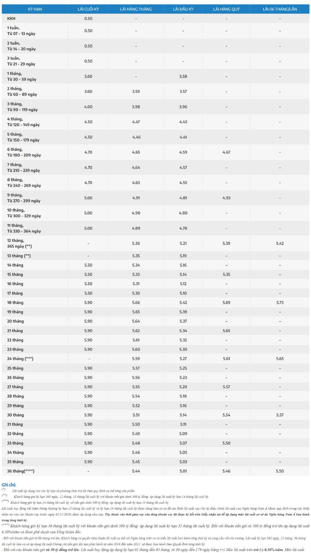 Biểu lãi suất của Nam A Bank. Ảnh chụp màn hình