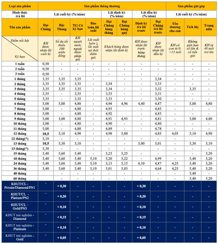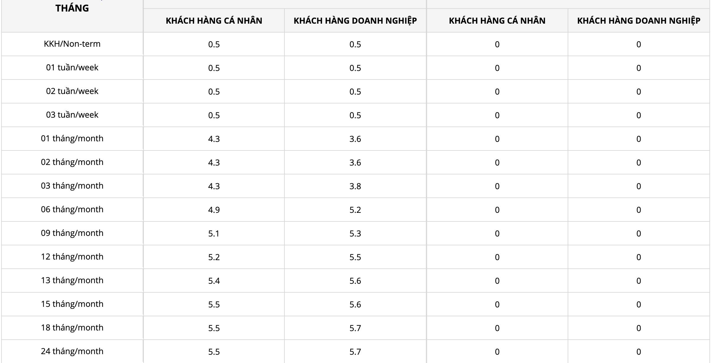 * Thông tin về lãi suất chỉ mang tính chất tham khảo và có thể thay đổi trong từng thời kì. Vui lòng liên hệ điểm giao dịch ngân hàng gần nhất hoặc hotline để được tư vấn cụ thể.