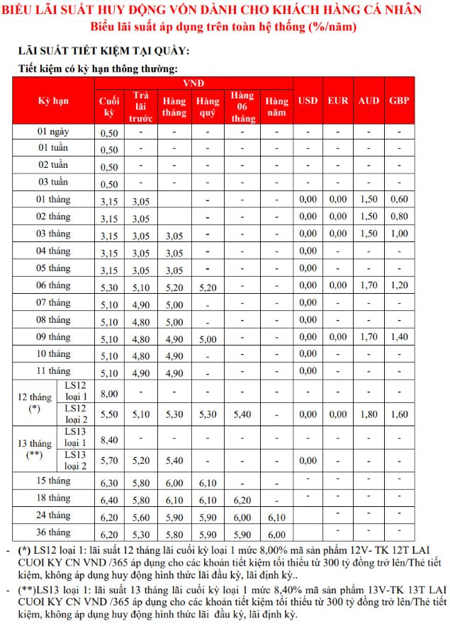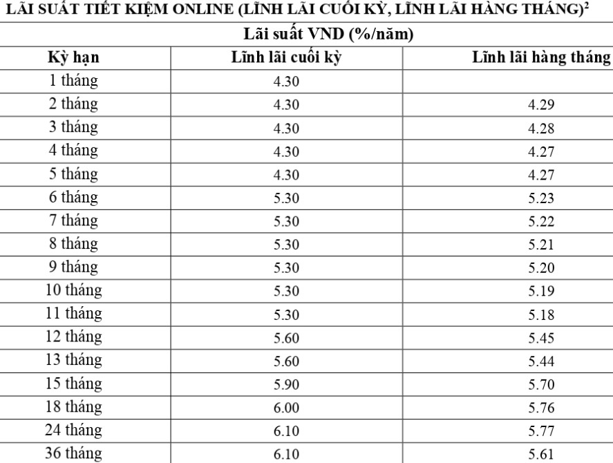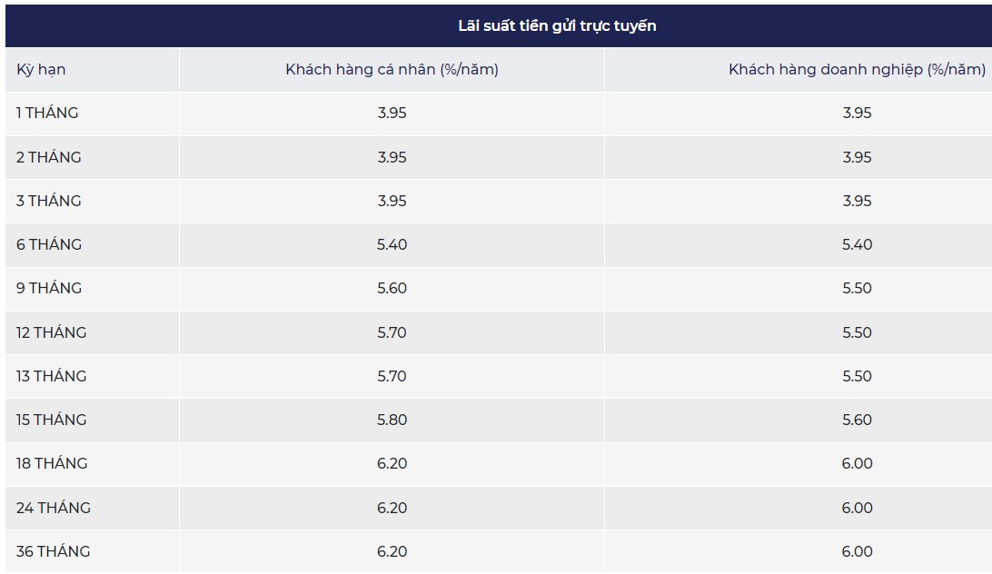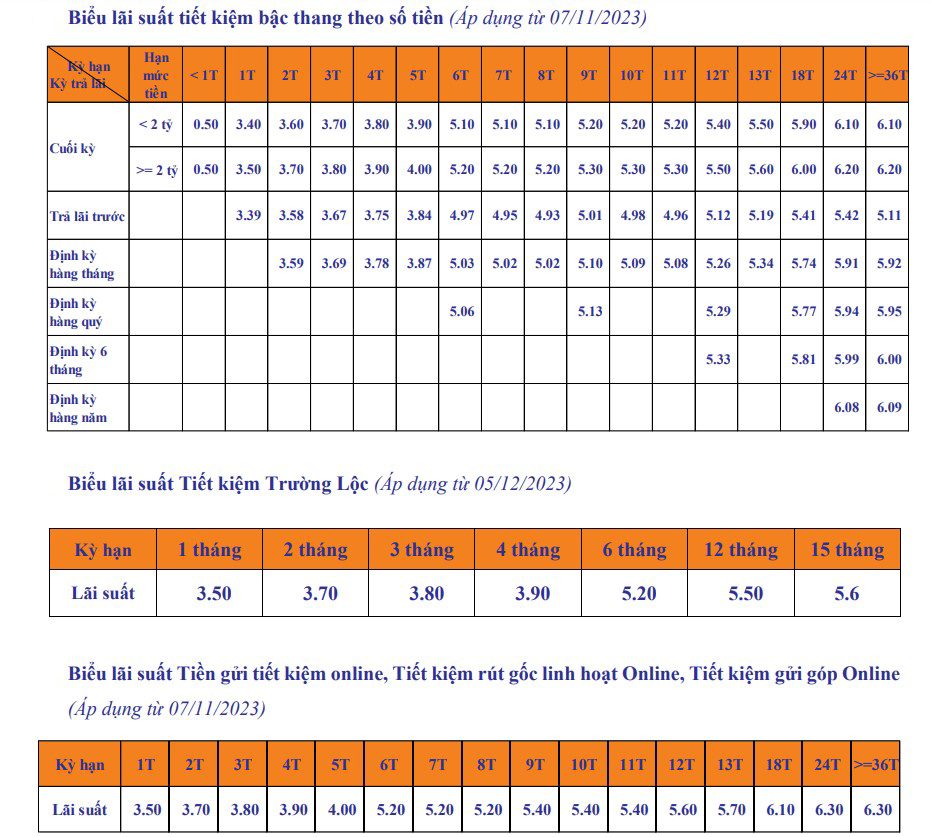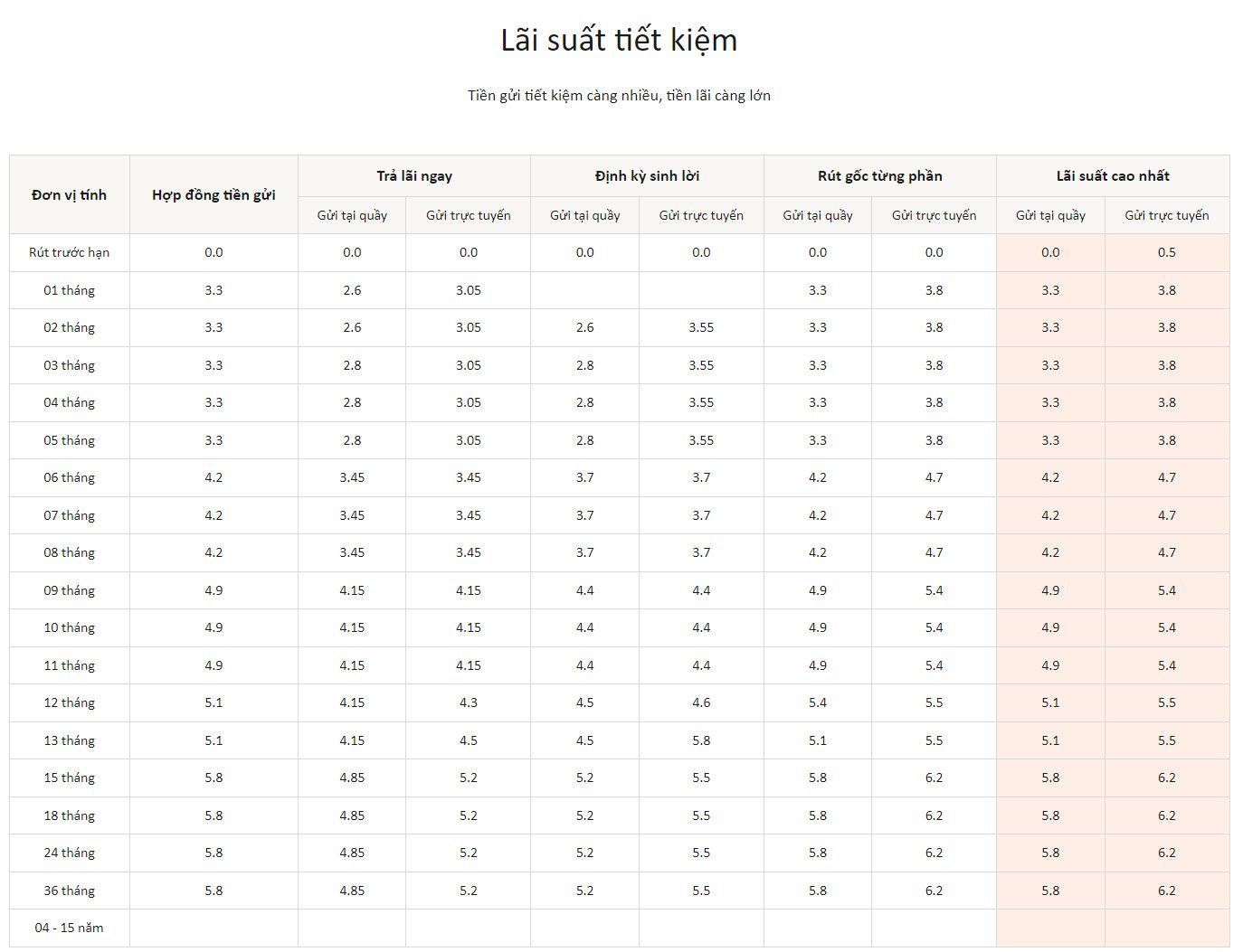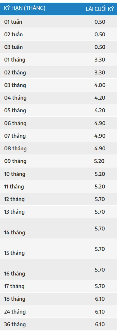 * Thông tin về lãi suất chỉ mang tính chất tham khảo và có thể thay đổi trong từng thời kì. Vui lòng liên hệ điểm giao dịch ngân hàng gần nhất hoặc hotline để được tư vấn cụ thể.