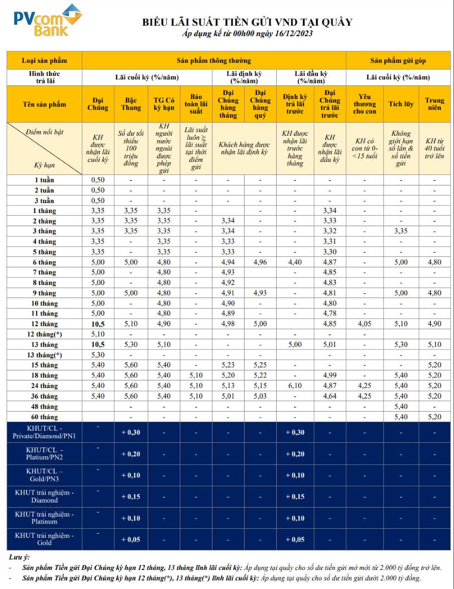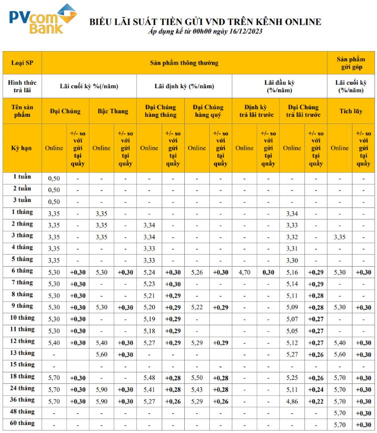 Cập nhật biểu lãi suất tại PVcomBank ngày 23.12.2023. Ảnh chụp màn hình