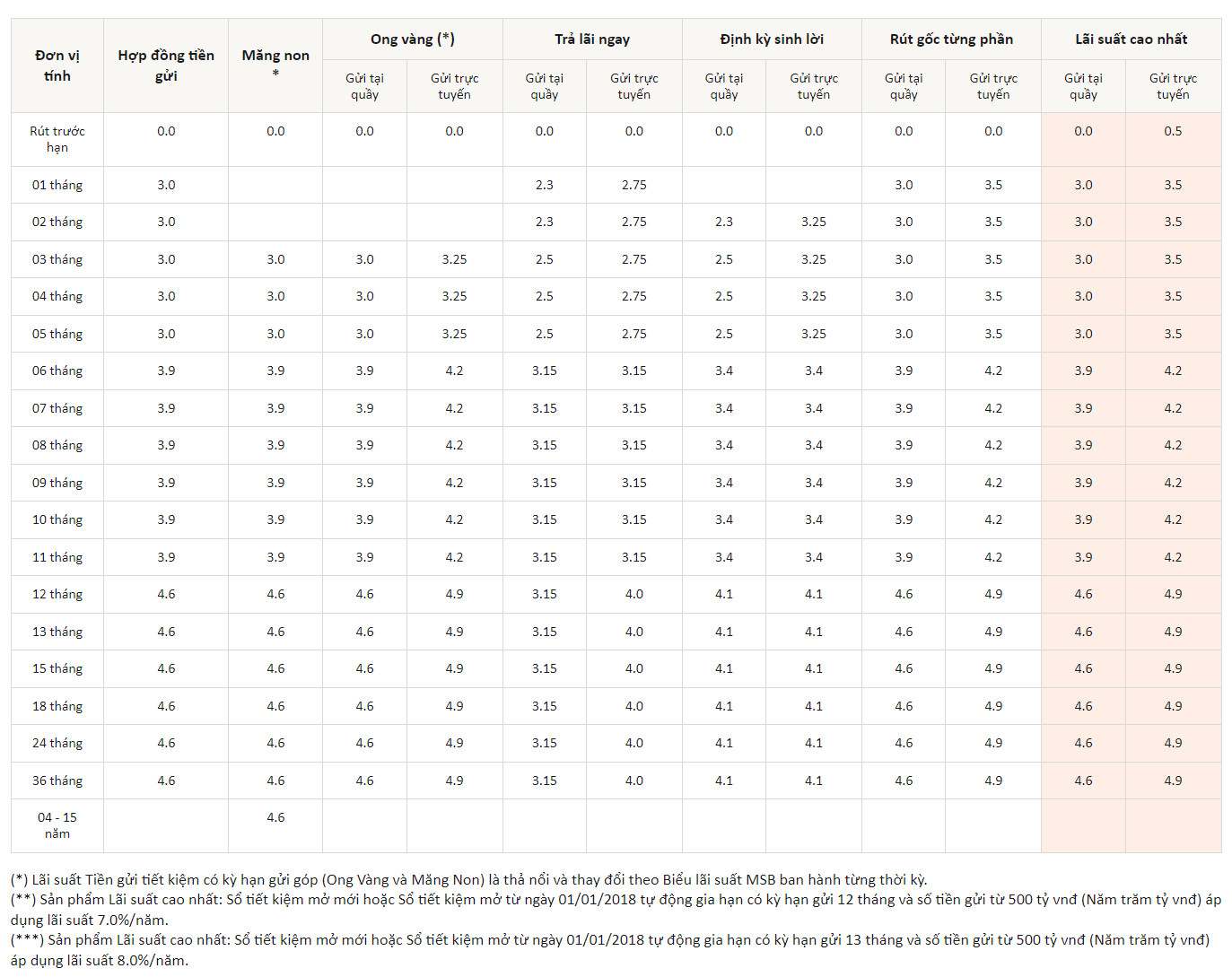 Cập nhật biểu lãi suất tạo MSB lúc 12h ngày 13.1.2024. Ảnh chụp màn hìnhGửi 500 triệu đồng, sau 9 tháng nhận hơn 20 triệu đồng tiền lãi