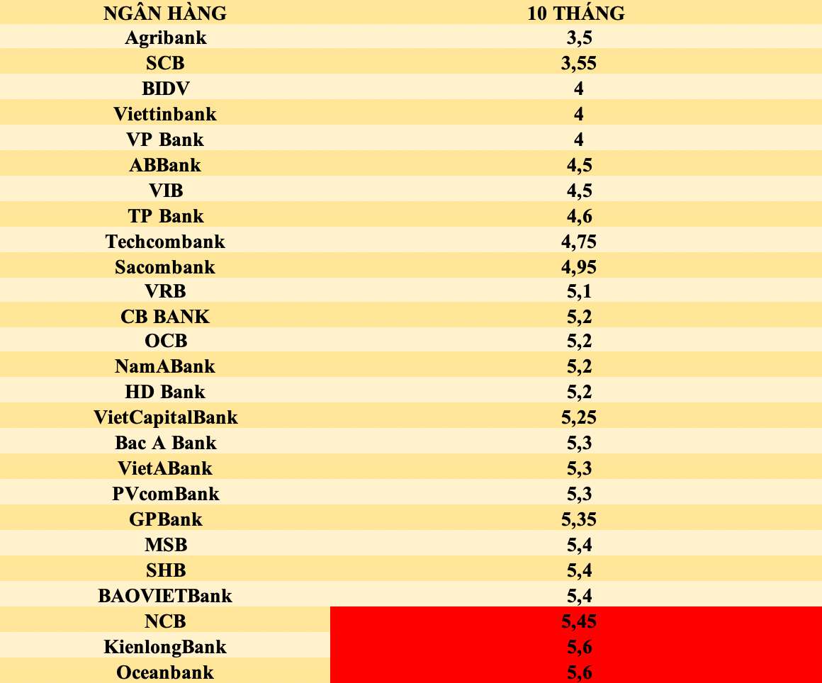Biểu lãi suất tiết kiệm NCB ngày 25.12.2023. Ảnh chụp màn hìnhDưới đây là bảng so sánh lãi suất tiết kiệm kỳ hạn 10 tháng trong hệ thống gần 30 ngân hàng, bạn đọc có thể tham khảo: