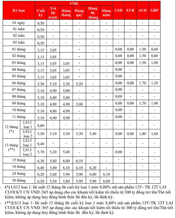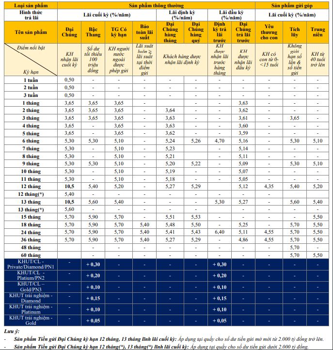 * Thông tin về lãi suất chỉ mang tính chất tham khảo và có thể thay đổi trong từng thời kì. Vui lòng liên hệ điểm giao dịch ngân hàng gần nhất hoặc hotline để được tư vấn cụ thể.
