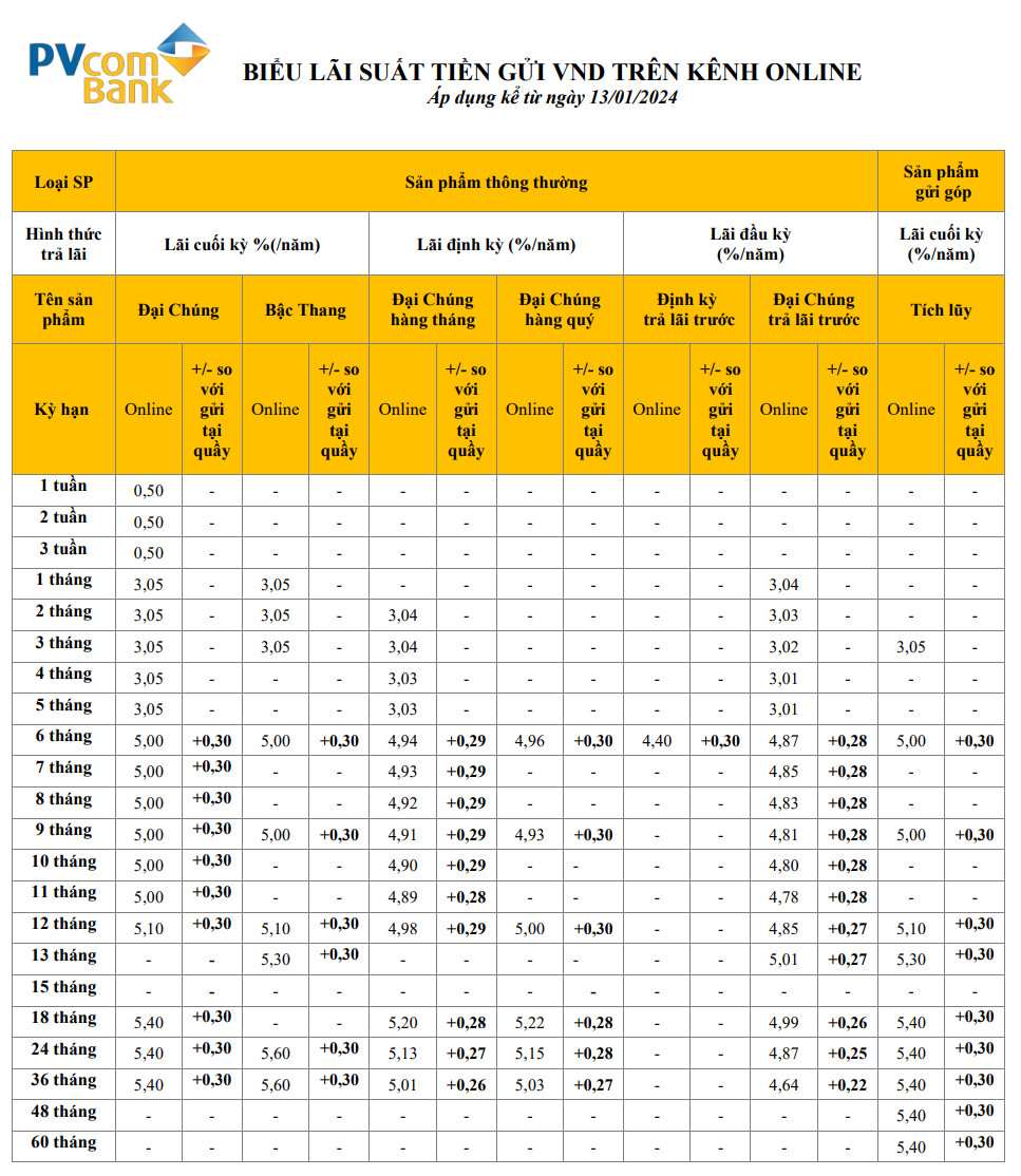 Biểu lãi suất tại quầy và online của PVcomBank ngày 14.1.2024. Ảnh chụp màn hình.Theo sau PVcombank, HDBank áp dụng mức 8,4%/năm cho kỳ hạn 13 tháng và 8%/năm cho kỳ hạn 12 tháng với điều kiện duy trì số dư tối thiểu 300 tỉ đồng...