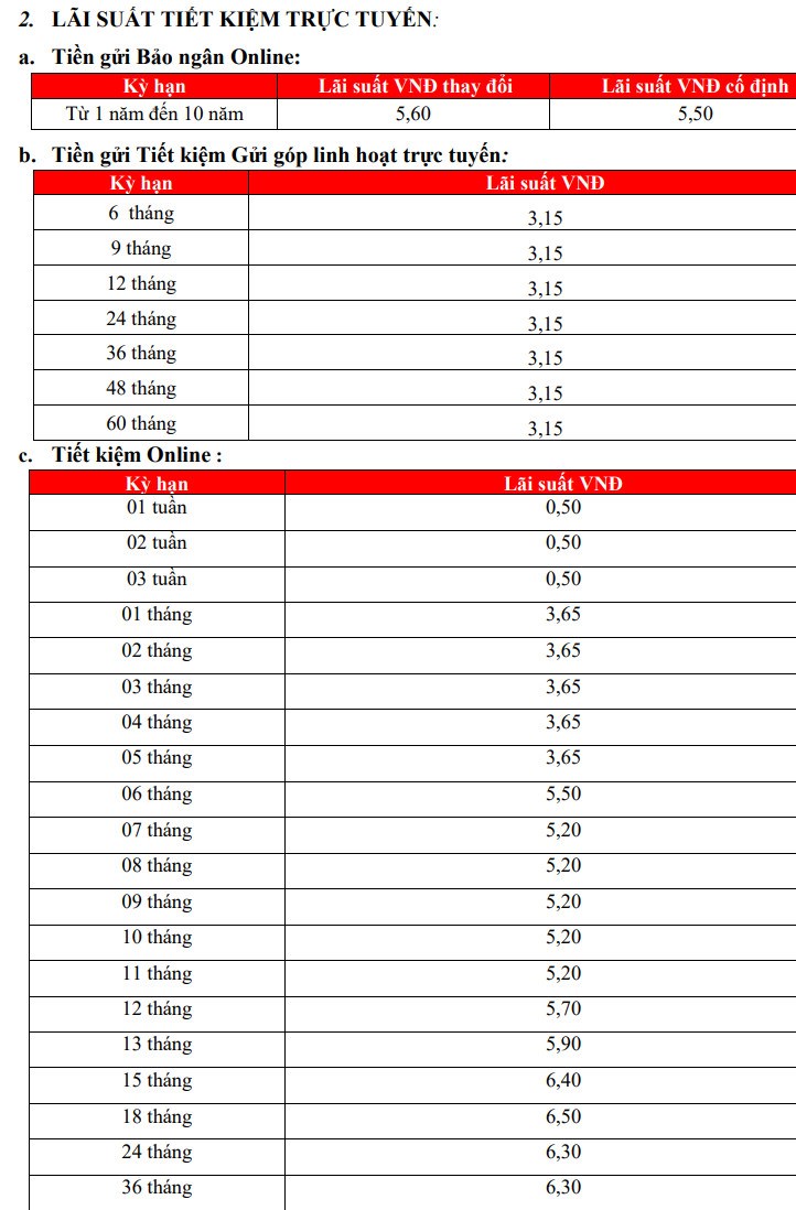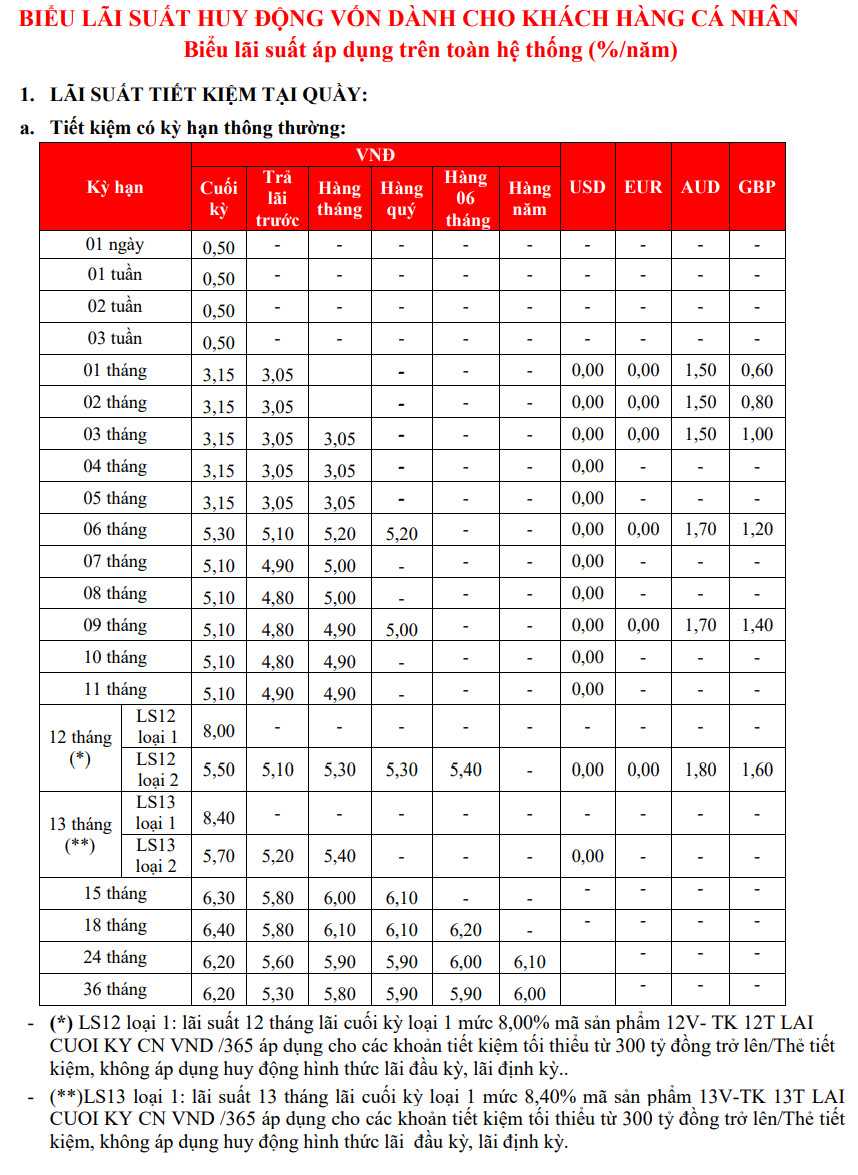 * Thông tin về lãi suất chỉ mang tính chất tham khảo và có thể thay đổi trong từng thời kì. Vui lòng liên hệ điểm giao dịch ngân hàng gần nhất hoặc hotline để được tư vấn cụ thể.