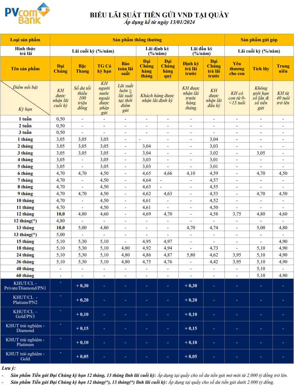 Mức lãi suất 10% được PVcomBank áp dụng với một số yêu cầu như số tiền gửi tối thiểu 2.000 tỉ đồng, gửi tại quầy, kỳ hạn gửi 12-13 tháng, nhận lãi cuối kỳ...