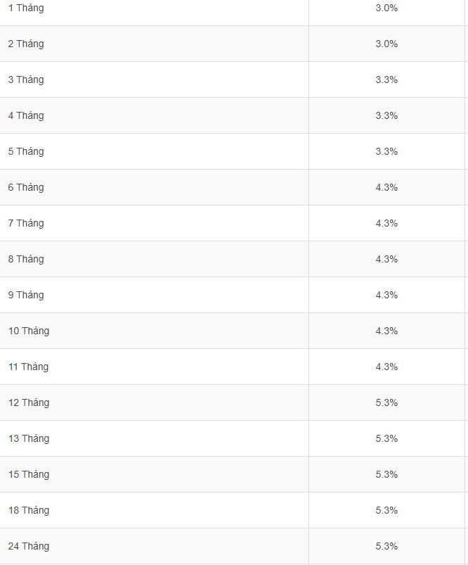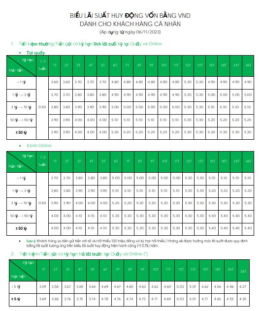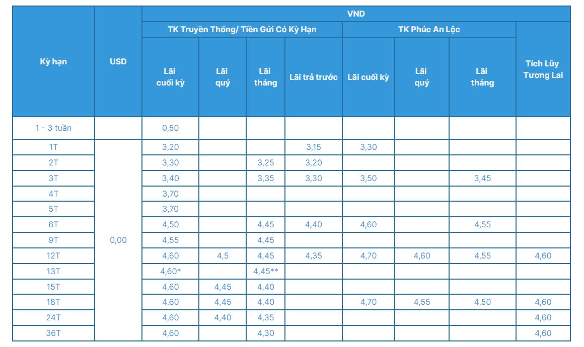 Thông tin về lãi suất chỉ mang tính chất tham khảo và có thể thay đổi trong từng thời kì. Vui lòng liên hệ điểm giao dịch ngân hàng gần nhất hoặc hotline để được tư vấn cụ thể.
