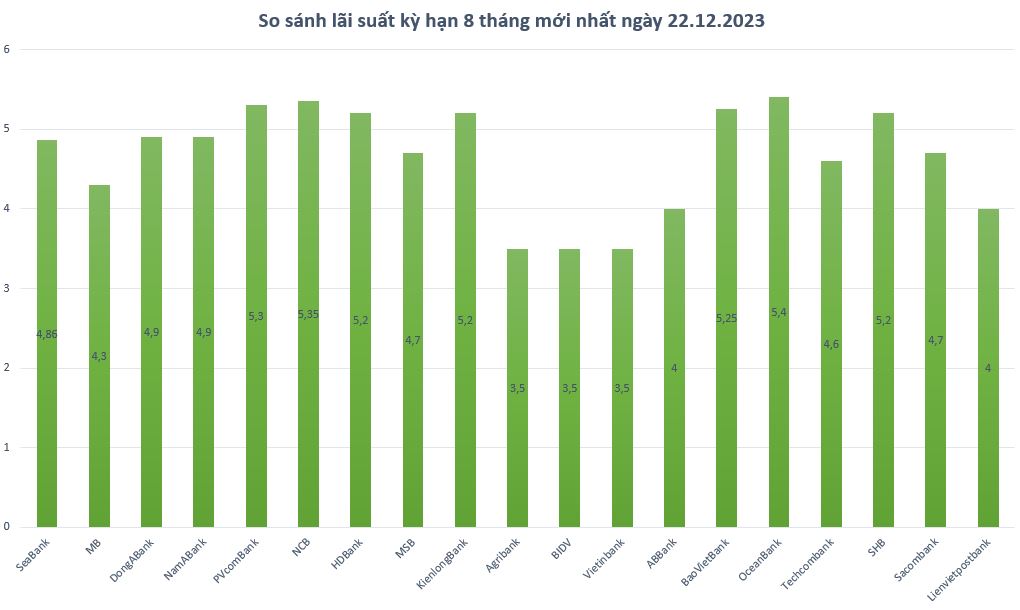 Ghi nhận từ PV Lao Động, lãi suất ngân hàng hôm nay (ngày 22.12.2023) đối với kỳ hạn gửi tiền 8 tháng tại 20 ngân hàng đang dao động quanh ngưỡng 3,5 - 5,4%, tuỳ từng hình thức gửi tiền.