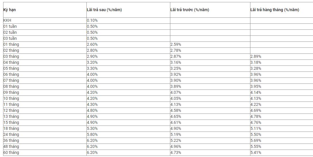 * Thông tin về lãi suất chỉ mang tính chất tham khảo và có thể thay đổi trong từng thời kỳ. Vui lòng liên hệ điểm giao dịch ngân hàng gần nhất hoặc hotline để được tư vấn cụ thể.