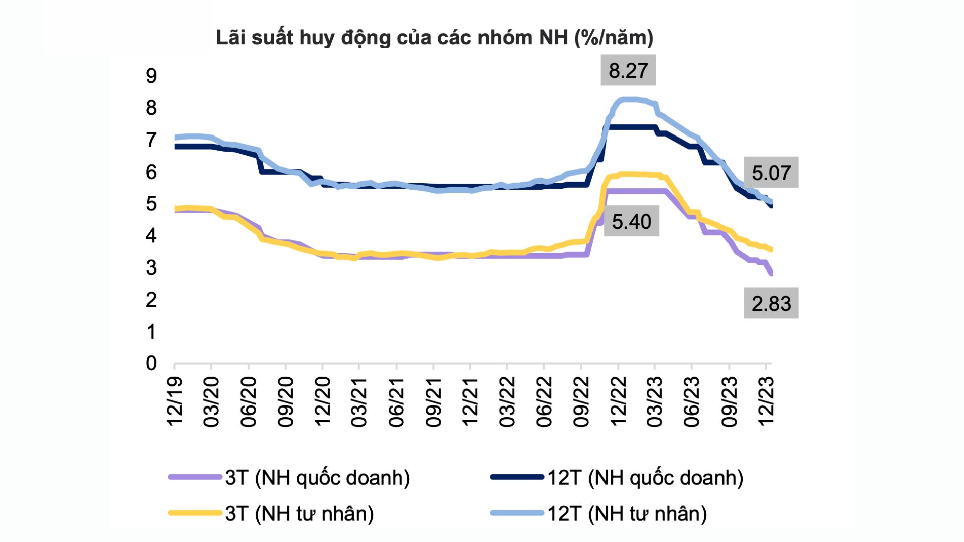 "Lãi suất tiền gửi kỳ hạn 12 tháng sẽ duy trì ở mức thấp khoảng 5,0%/năm từ cuối năm 2023 đến cuối năm 2024. Chúng tôi kỳ vọng lãi suất cho vay tiếp tục duy trì xu hướng giảm trong những tháng còn lại của năm nhờ chi phí vốn của các ngân hàng thương mại giảm nhanh trong thời gian gần đây" - chuyên gia đánh giá.