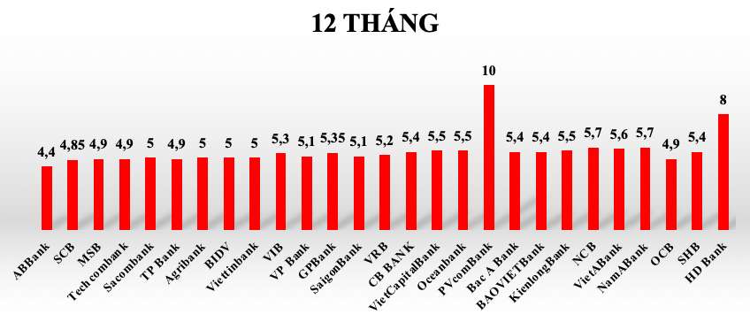 Tại kỳ hạn 12 tháng lãi suất tiết kiệm các ngân hàng trong hệ thống giao động từ 4,4%-10%/năm.