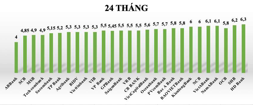 Tại kỳ hạn 24 tháng lãi suất tiết kiệm các ngân hàng trong hệ thống giao động từ 4%-6,3%/năm.