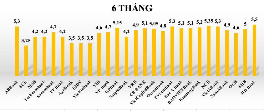 Tại kỳ hạn 6 tháng lãi suất tiết kiệm các ngân hàng trong hệ thống giao động từ 3,25%-5,5%/năm.