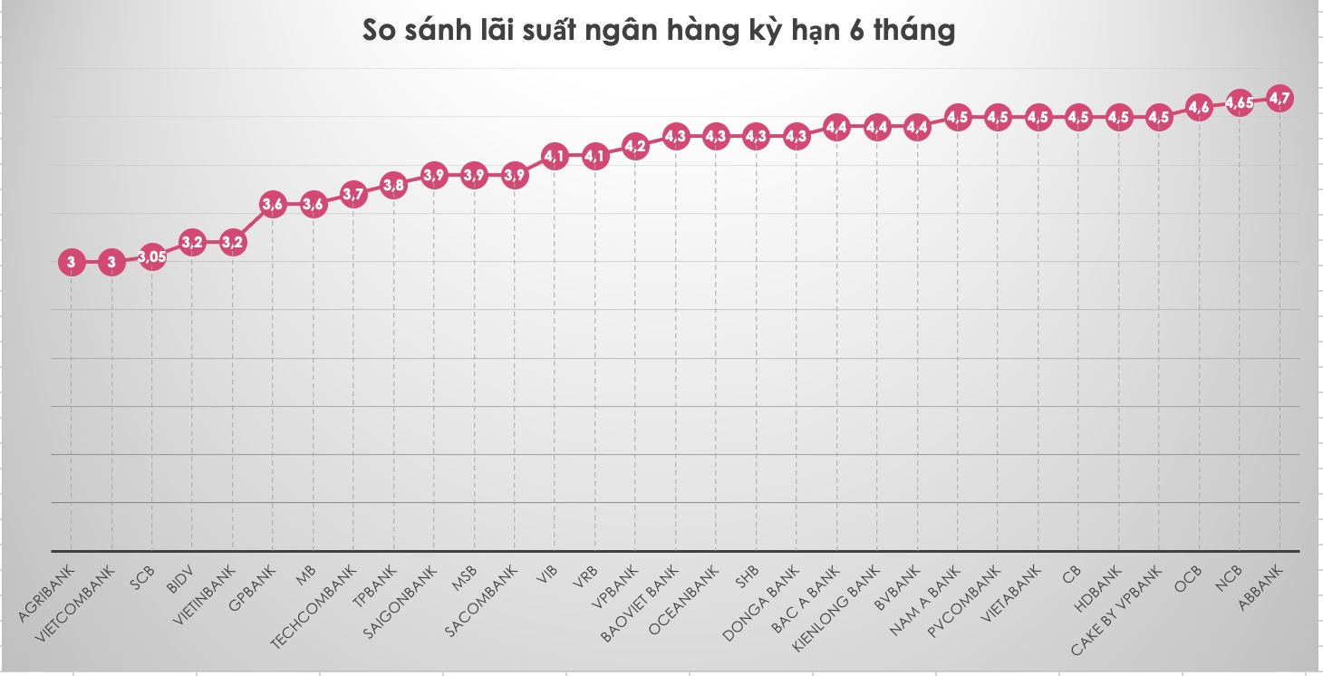 So sánh lãi suất ngân hàng cao nhất ở kỳ hạn 3 tháng. Đồ hoạ Trà MyLãi suất gửi tiết kiệm tại các ngân hàng kỳ hạn 6 tháng