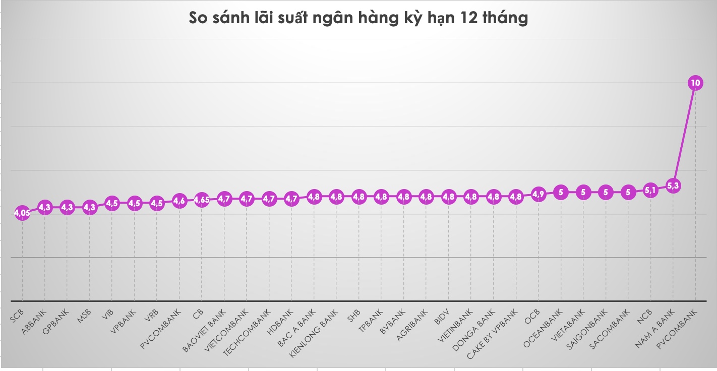 PVcomBank áp dụng mức lãi suất lên tới 10%/năm cho kỳ hạn gửi 12-13 tháng với số tiền gửi tối thiểu 2.000 tỉ đồng. Mức lãi suất trên áp dụng cho số tiền gửi khá lớn, 2.000 tỉ đồng.