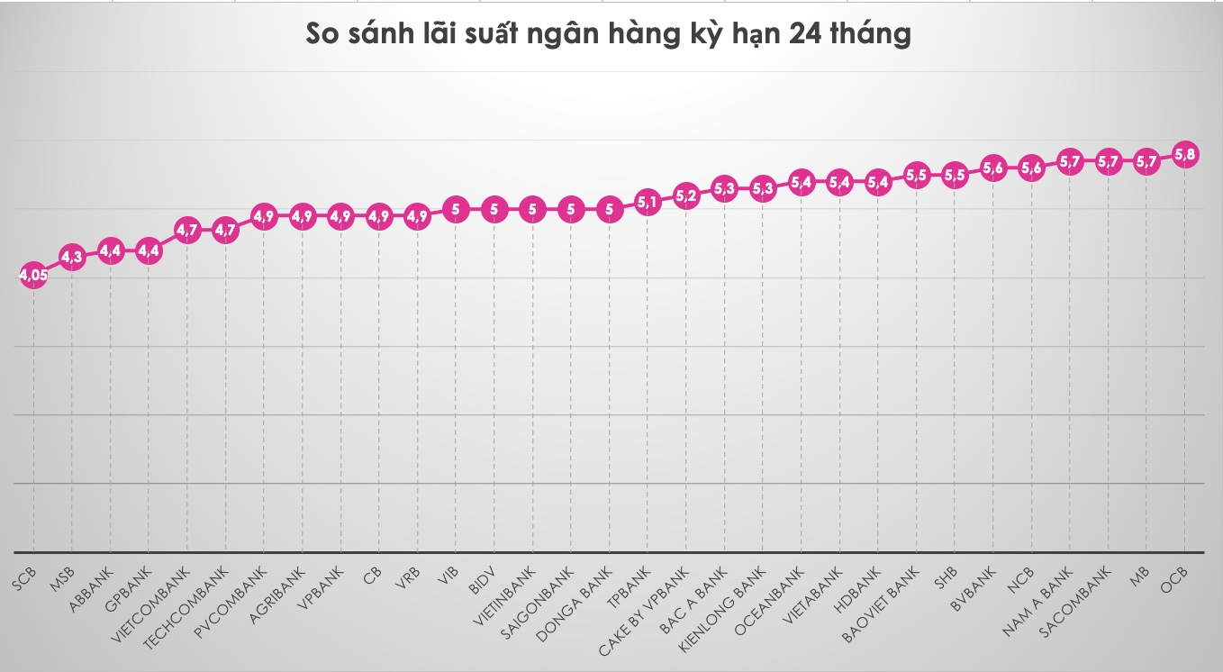 So sánh lãi suất ngân hàng cao nhất ở kỳ hạn 24 tháng. Đồ hoạ Trà MyThông tin về lãi suất chỉ mang tính chất tham khảo và có thể thay đổi trong từng thời kỳ. Vui lòng liên hệ điểm giao dịch ngân hàng gần nhất hoặc hotline để được tư vấn cụ thể.
