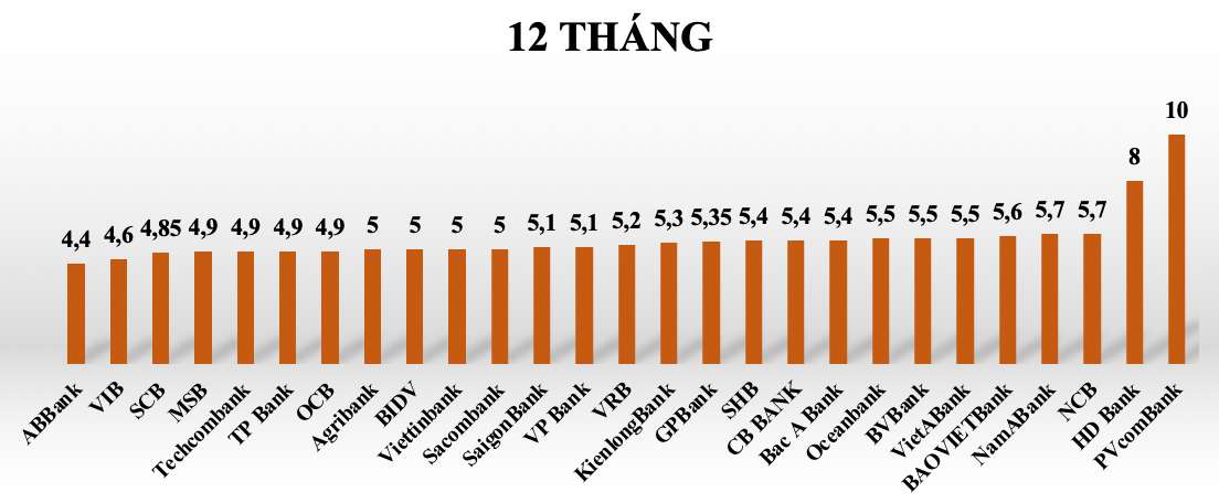 Tại kỳ hạn 12 tháng, lãi suất tiết kiệm các ngân hàng trong hệ thống dao động từ 4,4%-10%/năm. Một số ngân hàng có lãi suất cao trên 5,5% khi gửi tiết kiệm 12 tháng có thể kể tới như: PVcomBank (10%/năm), HDBank (8%/năm), ABBank (5,7%/năm)...
