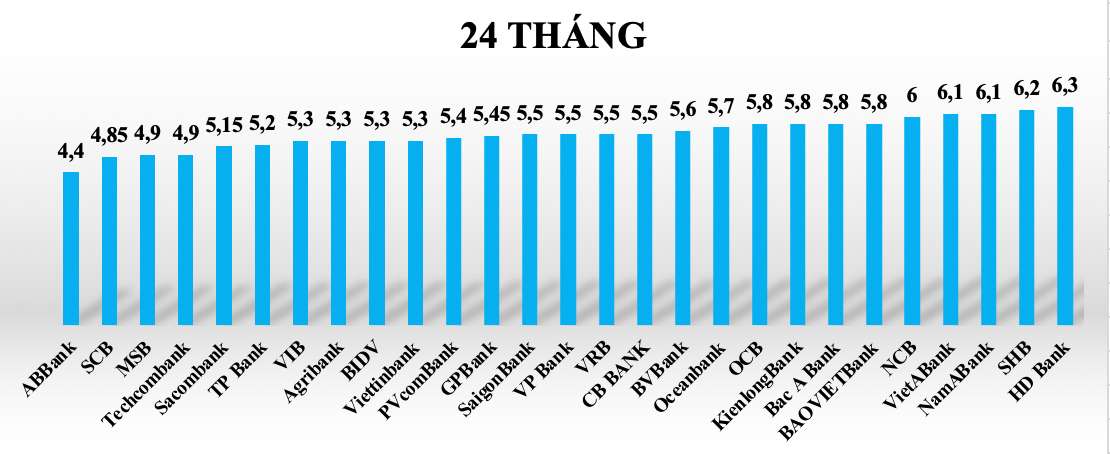 Tại kỳ hạn 24 tháng, lãi suất tiết kiệm các ngân hàng trong hệ thống dao động từ 4,4%-6,3%/năm. Một số ngân hàng có lãi suất cao trên 6% khi gửi tiết kiệm 24 tháng có thể kể tới như: HDBank (6,3%/năm), SHB (6,2%/năm), NamABank (6,1%/năm)...