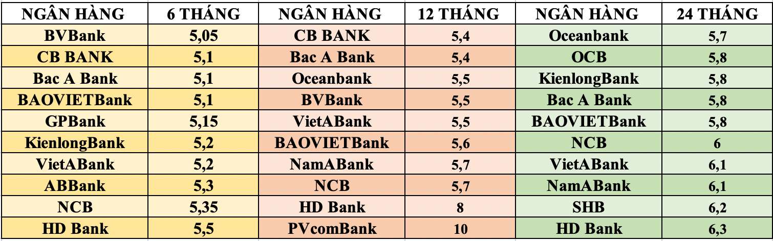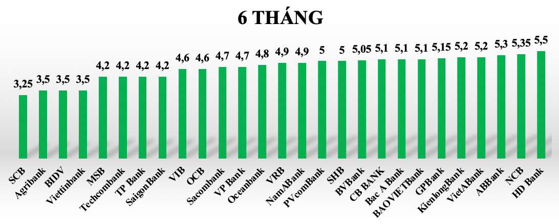 Tại kỳ hạn 6 tháng lãi suất tiết kiệm các ngân hàng trong hệ thống giao động từ 3,25%-5,5%/năm. Một số ngân hàng có lãi suất cao từ 5% khi gửi tiết kiệm 6 tháng có thể kể tới như HDBank (5,5%/năm), NCB (5,35%/năm), ABBank (5,3%/năm)...