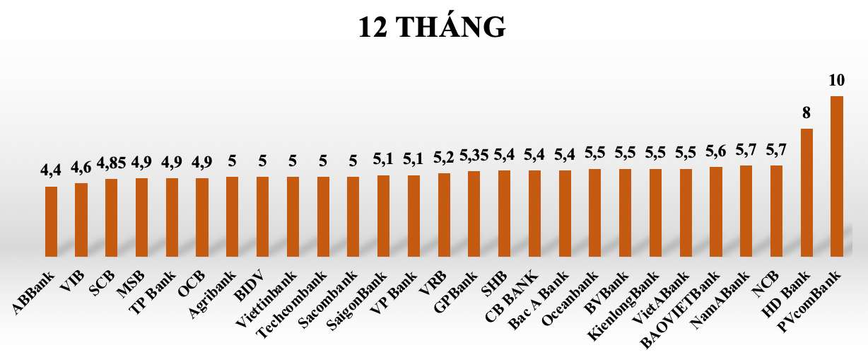 Tại kỳ hạn 12 tháng, lãi suất tiết kiệm các ngân hàng trong hệ thống dao động từ 4,4%-10%/năm. Một số ngân hàng có lãi suất cao trên 5,5% khi gửi tiết kiệm 12 tháng có thể kể tới như: PVcomBank (10%/năm), HDBank (8%/năm), NCB (5,7%/năm), NamABank (5,7%/năm)...