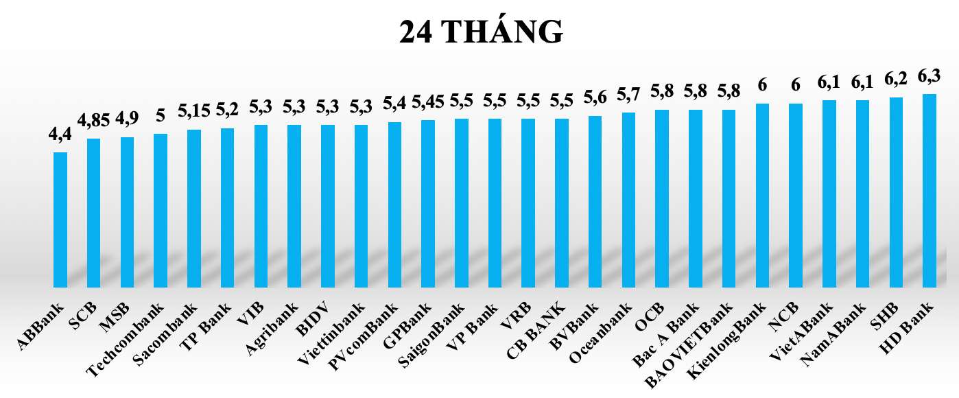 Tại kỳ hạn 24 tháng, lãi suất tiết kiệm các ngân hàng trong hệ thống dao động từ 4,4%-6,3%/năm. Một số ngân hàng có lãi suất cao trên 6% khi gửi tiết kiệm 24 tháng có thể kể tới như: HDBank (6,3%/năm), SHB (6,2%/năm), NamABank (6,1%/năm)...