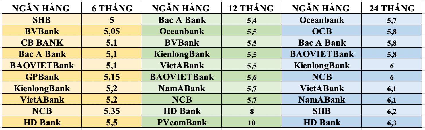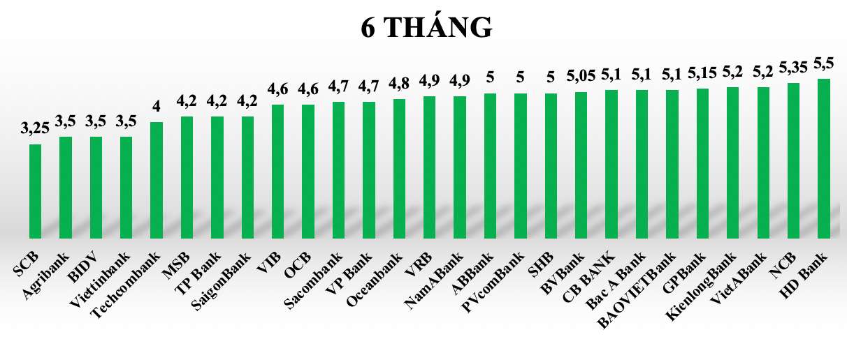 Tại kỳ hạn 6 tháng lãi suất tiết kiệm các ngân hàng trong hệ thống giao động từ 3,25%-5,5%/năm. Một số ngân hàng có lãi suất cao từ 5% khi gửi tiết kiệm 6 tháng có thể kể tới như HDBank (5,5%/năm), NCB (5,35%/năm), ABBank (5%/năm)...