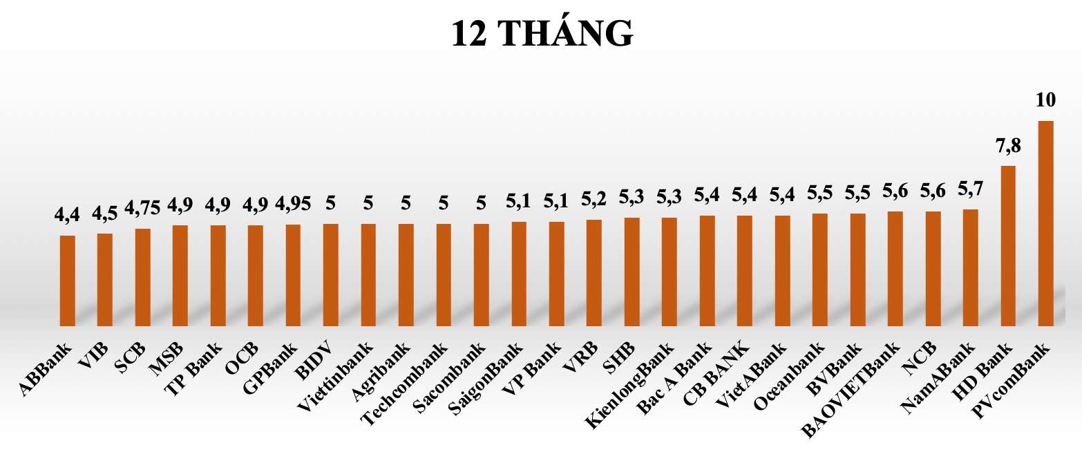 Tại kỳ hạn 12 tháng, lãi suất tiết kiệm các ngân hàng trong hệ thống dao động từ 4,4%-10%/năm. Một số ngân hàng có lãi suất cao trên 5,5% khi gửi tiết kiệm 12 tháng có thể kể tới như: PVcomBank (10%/năm), HDBank (7,8%/năm), NCB (5,6%/năm), NamABank (5,7%/năm)...