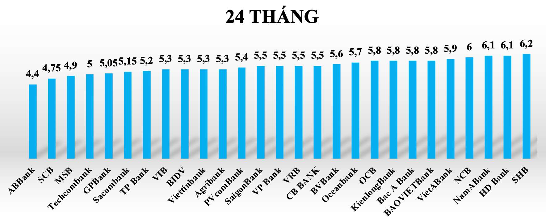Tại kỳ hạn 24 tháng, lãi suất tiết kiệm các ngân hàng trong hệ thống dao động từ 4,4%-6,2%/năm. Một số ngân hàng có lãi suất cao trên 6% khi gửi tiết kiệm 24 tháng có thể kể tới như: HDBank (6,1%/năm), SHB (6,2%/năm), NamABank (6,1%/năm)...