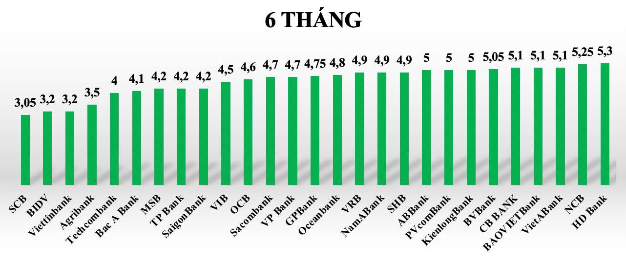 Tại kỳ hạn 6 tháng, lãi suất tiết kiệm các ngân hàng trong hệ thống dao động từ 3,05%-5,3%/năm. Một số ngân hàng có lãi suất cao từ 5% khi gửi tiết kiệm 6 tháng có thể kể tới như HDBank (5,3%/năm), NCB (5,25%/năm), VietABank (5,1%/năm)...