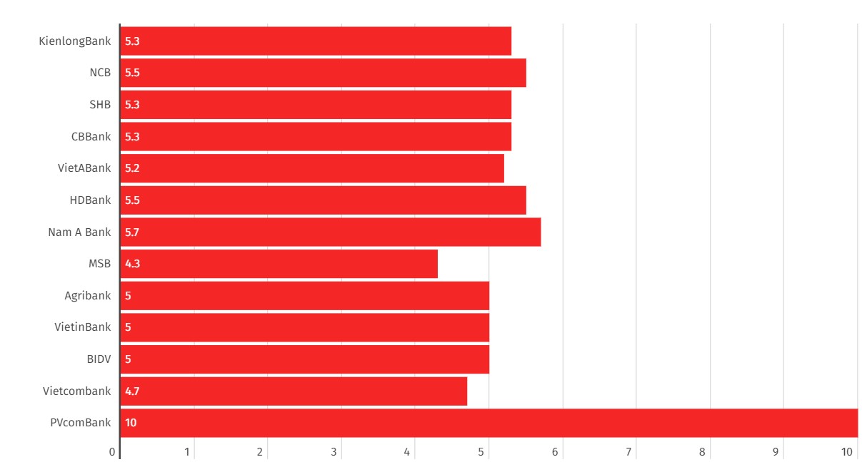 Trong đó, lãi suất PVcomBank cao nhất là 10%, khi khách hàng gửi tiết kiệm kỳ hạn 12 tháng, với điều kiện số tiền gửi từ 2.000 tỉ đồng trở lên. Các kỳ hạn gửi tiết kiệm khác, lãi suất PVcomBank dao động từ 5,0 - 5,4%...