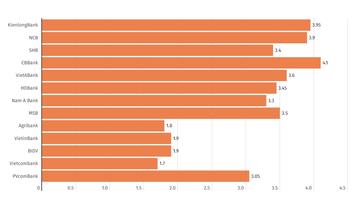 So sánh lãi suất ngân hàng kỳ hạn 9 tháng hôm nay. Biểu đồ: Khương DuySo sánh lãi suất ngân hàng kỳ hạn 12 tháng