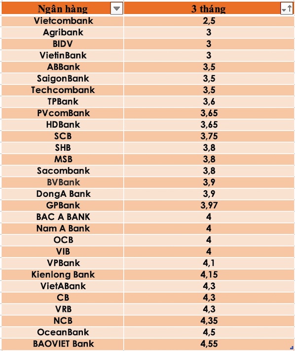 Ngân hàng có lãi suất thấp nhất kỳ hạn 3 tháng là Vietcombank với 2,5%/năm. Ngoài ra, VietinBank và BIDV, Agribank cũng chỉ ở mức 3%/năm.