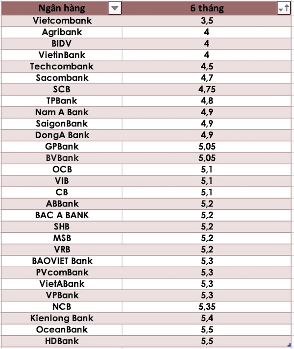 Lãi suất thấp nhất 6 tháng thuộc về Vietcombank là 3,5%. Các ngân hàng Agribank, BIDV, VietinBank với mức lãi suất là 4%/năm. Ngoài ra, Sacombank, Techcombank cũng chỉ ở mức 4,7-4,9%.