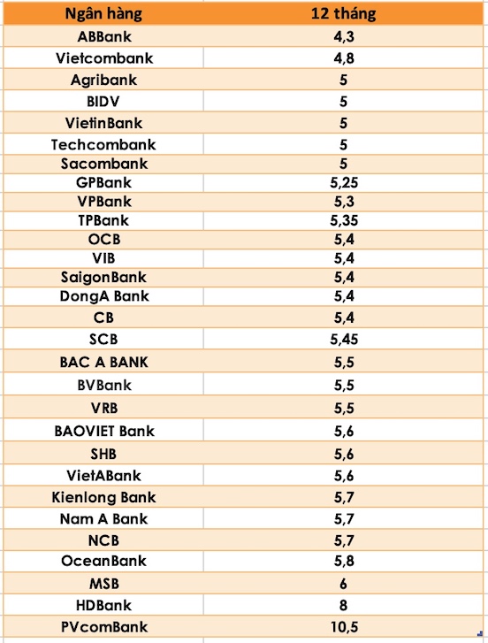Ngân hàng có lãi suất thấp nhất là ABBank là 4,3%. Lãi suất của Vietcombank là 4,8%/năm. Ngoài ra, Techcombank 5%, Sacombank 5% cũng là những lãi suất khá khiêm tốn.
