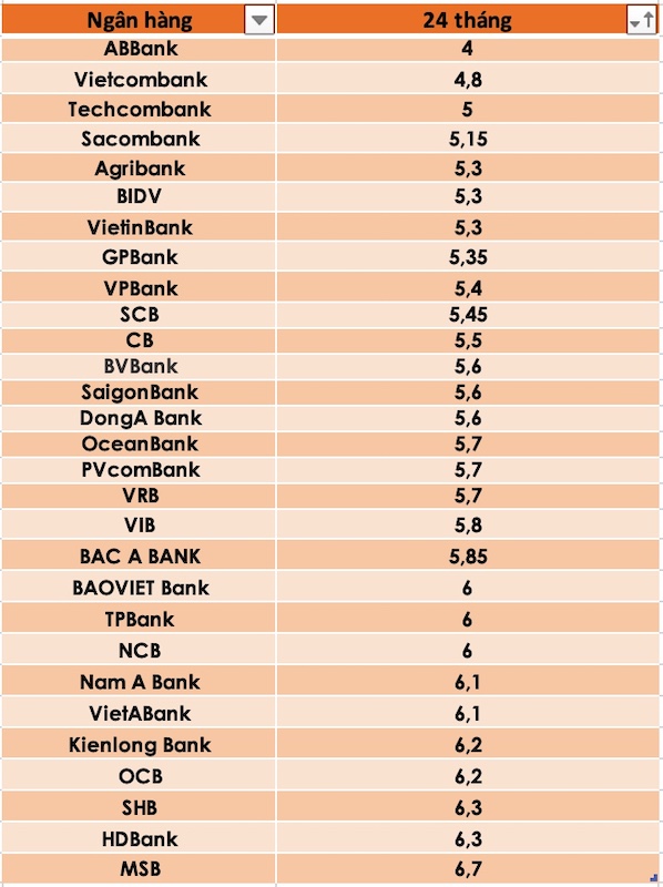 Ngân hàng có lãi suất thấp nhất 24 tháng là ABBank với mức 4%. Hai ngân hàng Vietcombank và BIDV có lãi suất thấp ở mức 4,8%/năm.