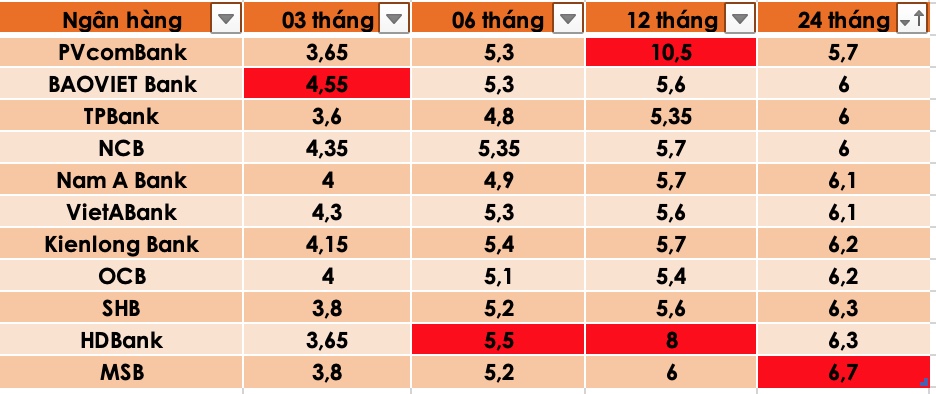 Cuối cùng, với kỳ hạn 24 tháng, MSB là ngân hàng có mức lãi suất hấp dẫn nhất với 6,7%/năm. Ngoài ra, các ngân hàng như Nam A Bank, OCB niêm yết lãi suất ở mức 6,1-6,2%/năm.