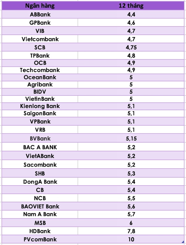 Tại kỳ hạn 12 tháng, PVcomBank là ngân hàng có lãi suất cao nhất lên tới 10%, HDBank với 7,8%; MSB với 7,6%. Trong khi đó, nhóm các ngân hàng Vietcombank, Agribank, BIDV, Vietinbank vẫn giữ nguyên mức 5%/năm - thấp nhất. Như vậy, chênh lệch lãi suất tối đa tại kỳ hạn này lên tới 5%/năm.
