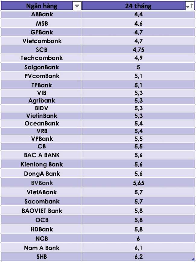 Cuối cùng, kỳ hạn 24 tháng, lãi suất cao nhất là 6,2%/năm của SHB. Lãi suất thấp nhất là 4,7%/năm của Vietcombank và MSB. Chênh lệch lãi suất các ngân hàng ở mức 1,5%/năm.
