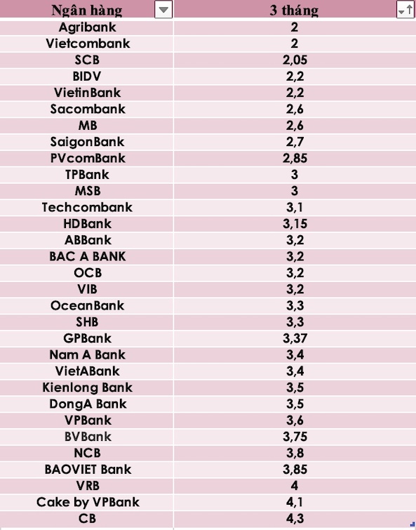 Ngân hàng có mức lãi suất thấp nhất kỳ hạn 3 tháng là Agribank với 2%. Một số ngân hàng khác cũng có mức lãi suất thấp ở mức 2% gồm Vietcombank, SCB.
